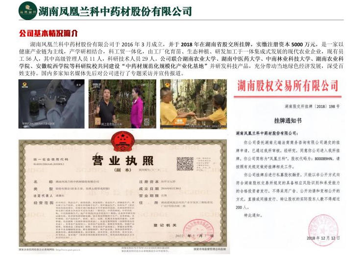 湖南凤凰兰科中药材股份有限公司,许可项目:药品生产;酒类经营;食品销售;食品生产;酒制品生产;林木种子生产经营;主要农作物种子生产;茶叶制品生产;饮料生产(依法须经批准的项目,经相关部门批准后方可开展经营活动,具体经营项目以相关部门批准文件或许可证件为准)一般项目:中草药种植;中草药收购;中药提取物生产;地产中草药(不含中药饮片)购销;农业科学研究和试验发展;医学研究和试验发展;非主要农作物种子生产;水果种植;茶叶种植;农产品的生产、销售、加工、运输、贮藏及其他相关服务;石斛种植;食品销售(仅销售预包装食品);食品互联网销售(仅销售预包装食品);食用农产品初加工;食用农产品批发;新鲜水果批发;农副产品销售;保健食品(预包装)销售;非食用农产品初加工;智能农业管理;农业专业及辅助性活动;野生植物保护;林产品采集;森林经营和管护;森林改培;森林固碳服务;技术服务、技术开发、技术咨询、技术交流、技术转让、技术推广(除依法须经批准的项目外,凭营业执照依法自主开展经营活动)。