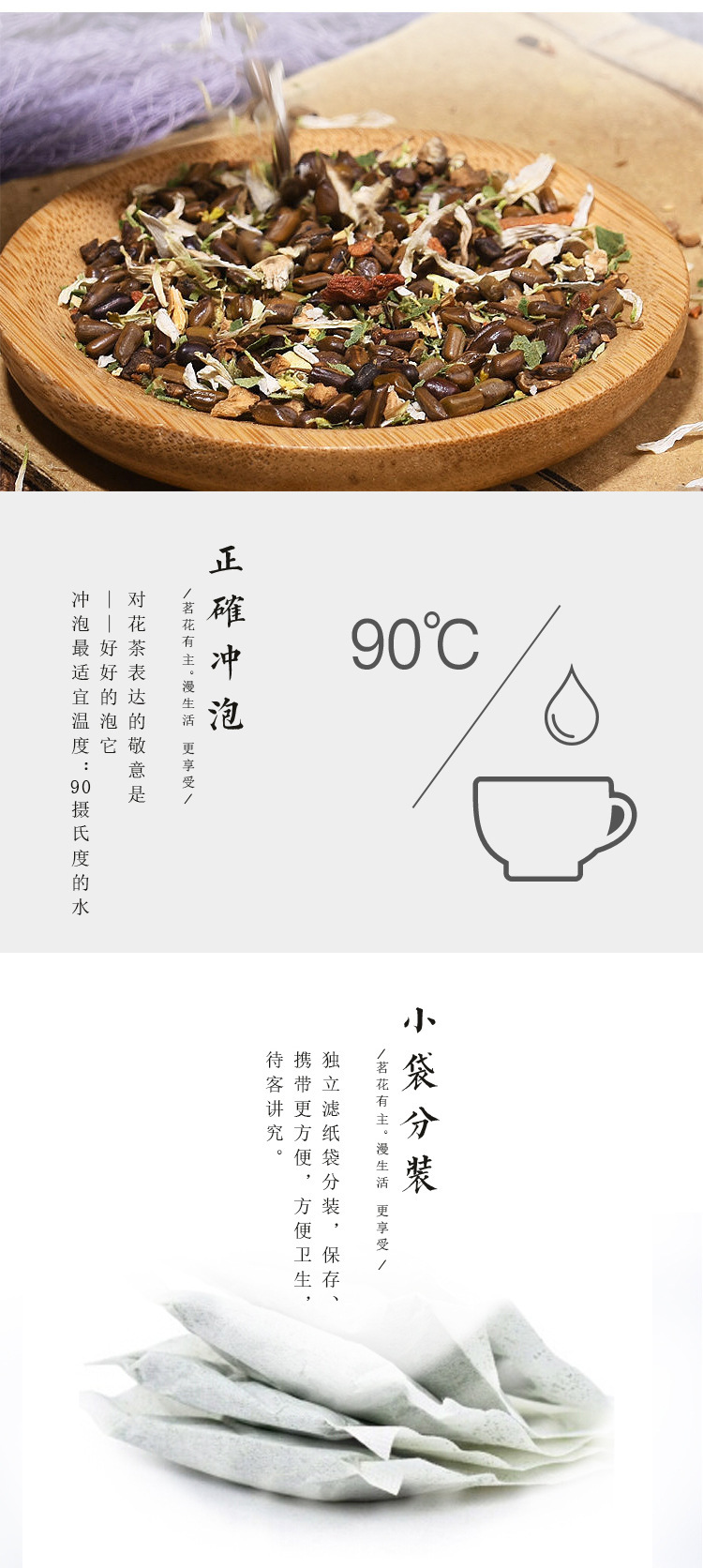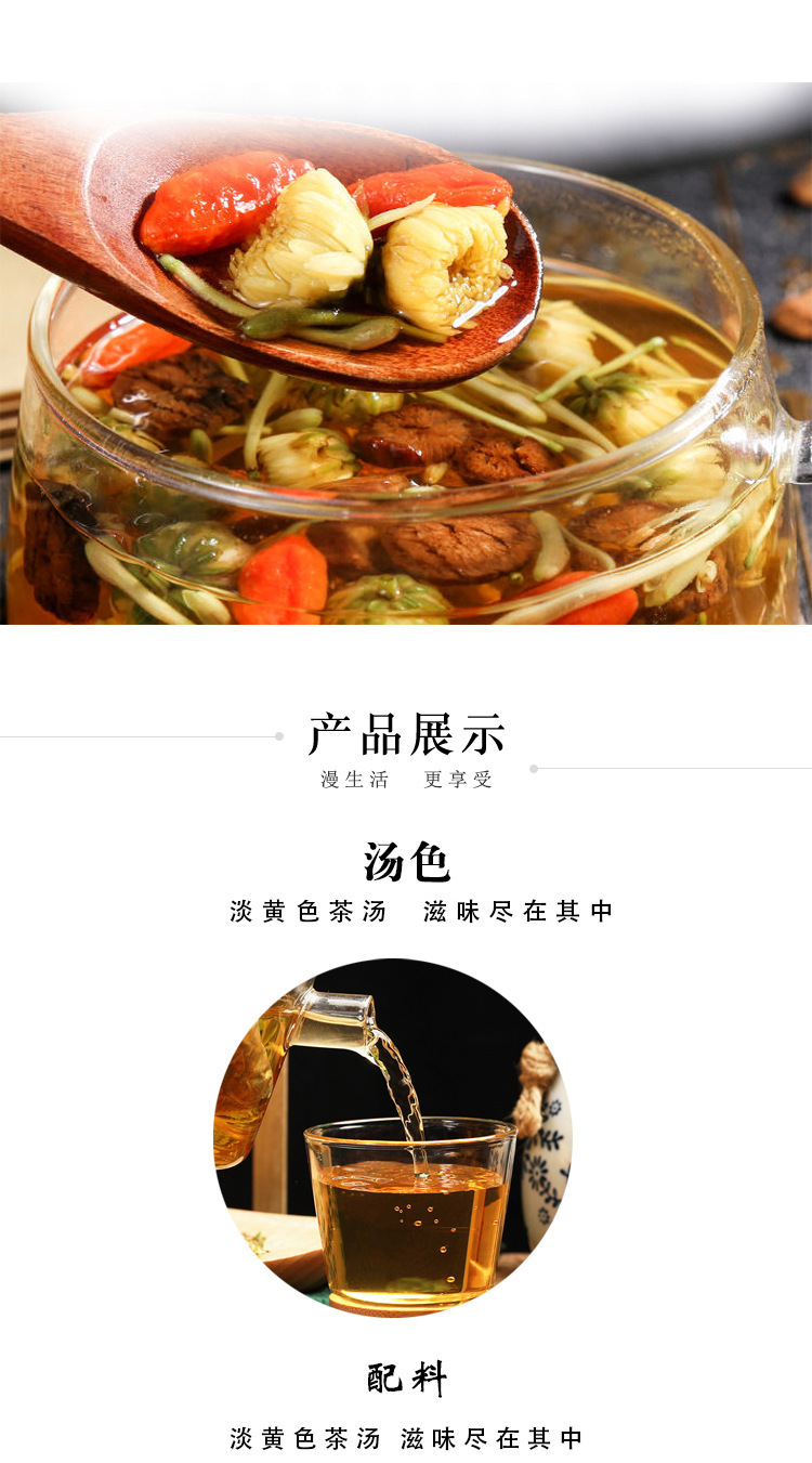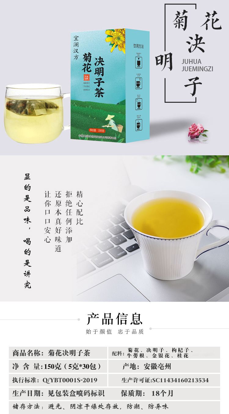 原料与配料菊花、决明子、枸杞子、牛蒡根、金银花、桂花