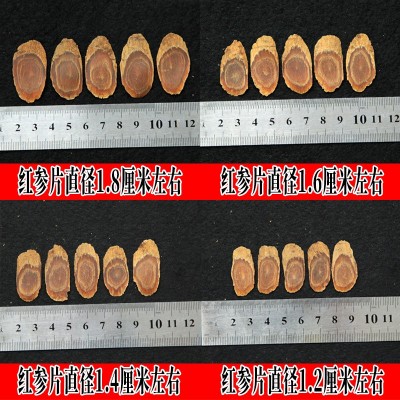 1.我们这个是无糖的红参片,没有西洋红都是实实在在的东西,特别的干,嘎嘎好,声音清脆,(备注:夏天回潮除外)说明一下无糖的红参表面光滑有纹路,纹路越深的越老。 2.A级和B级的区别,A级是漂亮的货切的都是六年到八年,都是精选货,B级是5-6年根切的纹路淡一点,推荐给微商,大货各种标准药厂标准都有可以开增票, 3.批发各种高丽参片东洋参片药厂标准货需要找老板联系