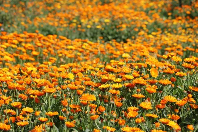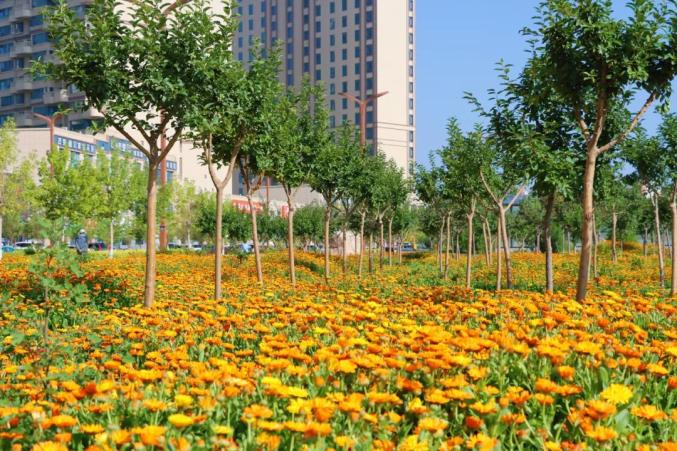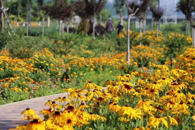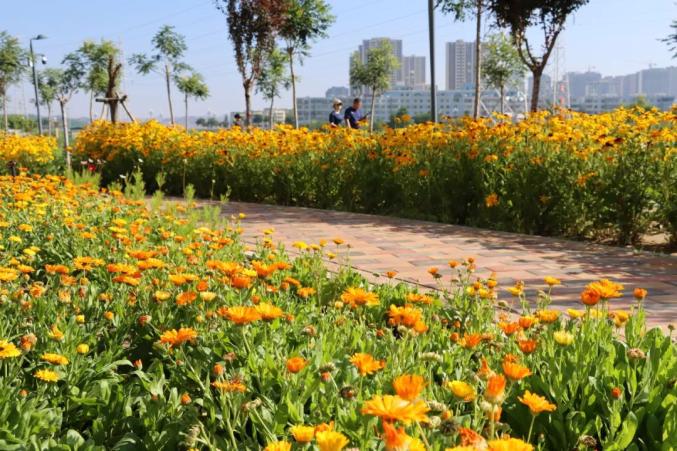 进入盛夏,金沟河地标展示段(北京路至长安路段)迎来最热闹的花期。沿岸的金盏菊铺展成金色浪潮,层层叠叠的花瓣在阳光下泛着柔光,穿插其间的黑心金光菊,墨色花芯顶着放射状黄瓣,引得蜜蜂钻进花丛,更添一份野趣。