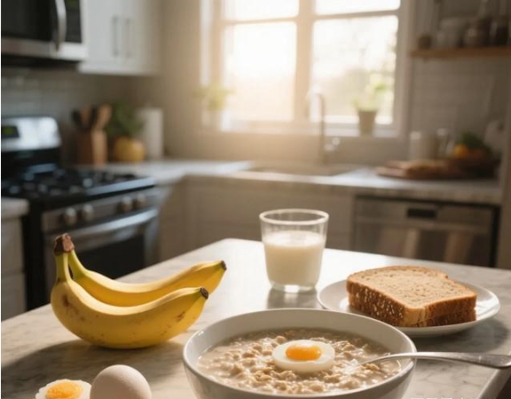 早餐燕麦粥+3个蛋+香蕉,持续供能不低血糖。10点吃全麦面包+花生酱,补脂肪促睾酮。