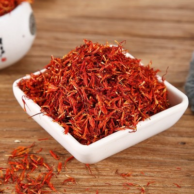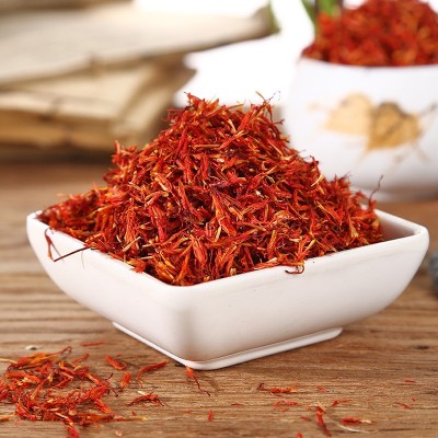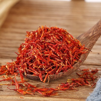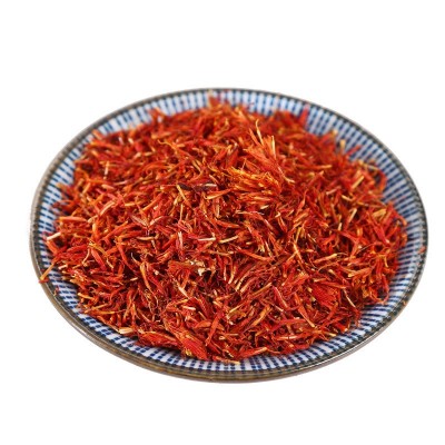 红花,(拉丁学名:Carthamus tinctorius L.),别名:红蓝花、刺红花,菊科、红花属植物,干燥的管状花,橙红色,花管狭细,先端5裂,裂片狭线形,花药黄色,联合成管,高出裂片之外,其中央有柱头露出。具特异香气,味微苦。以花片长、色鲜红、质柔软红花,(拉丁学名:Carthamus tinctorius L.),别名:红蓝花、刺红花,菊科、红花属植物,干燥的管状花,橙红色,花管狭细,先端5裂,裂片狭线形,花药黄色,联合成管,高出裂片之外,其中央有柱头露出。具特异香气,味微苦。以花片长、色鲜红、质柔软