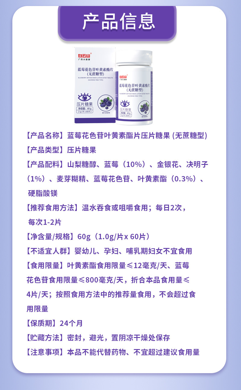 白云山蓝莓花色苷叶黄素酯片无蔗糖型厂家批发代发