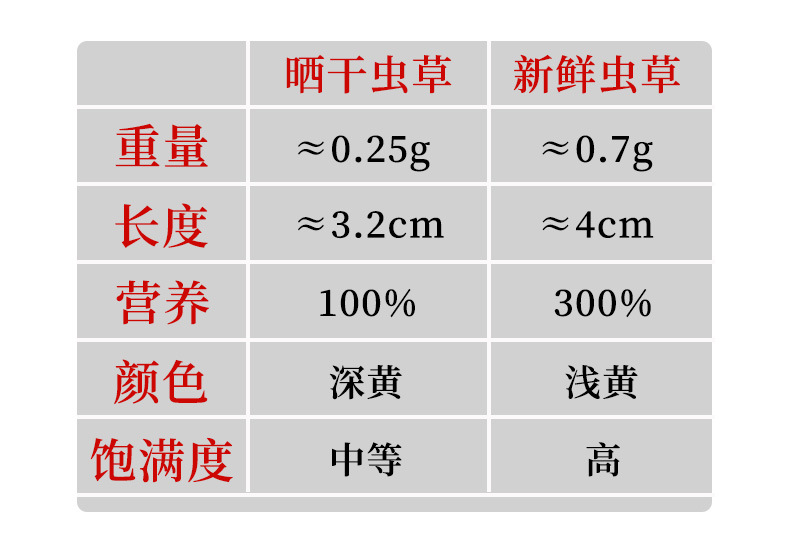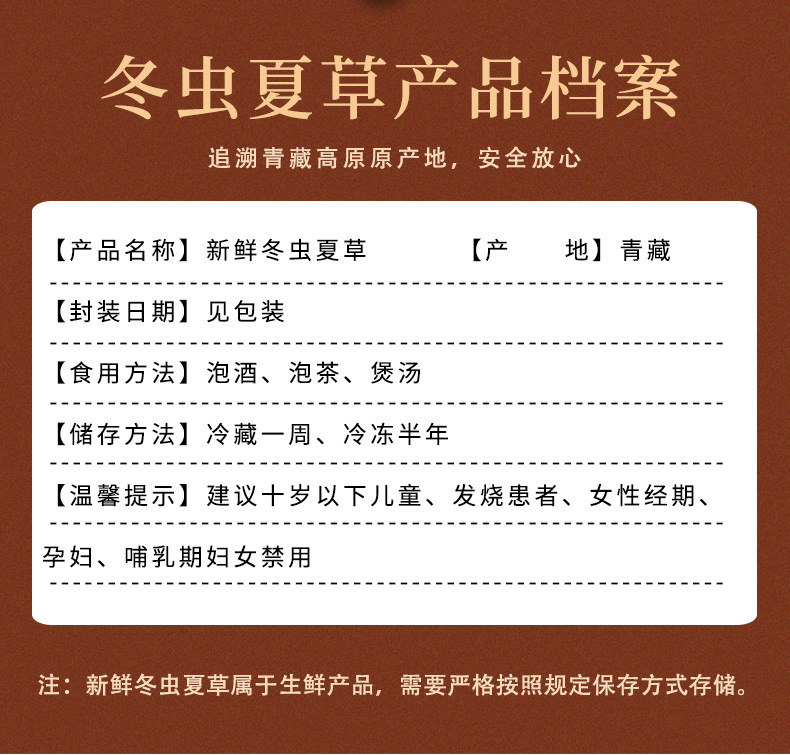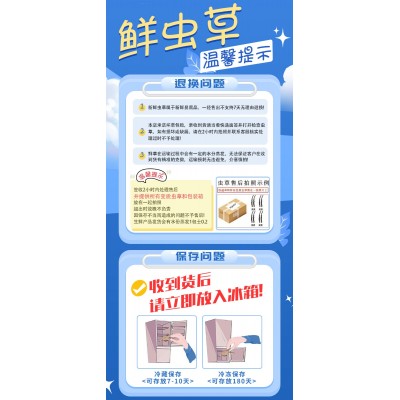 2、若有坏草、烂草、断草、草或者克重不符由卖家按比例赔付,买家不得拒收退回;新鲜虫草为娇贵生鲜不能以任何理由拒收,由耽误取件导致变质,卖家不予售后。