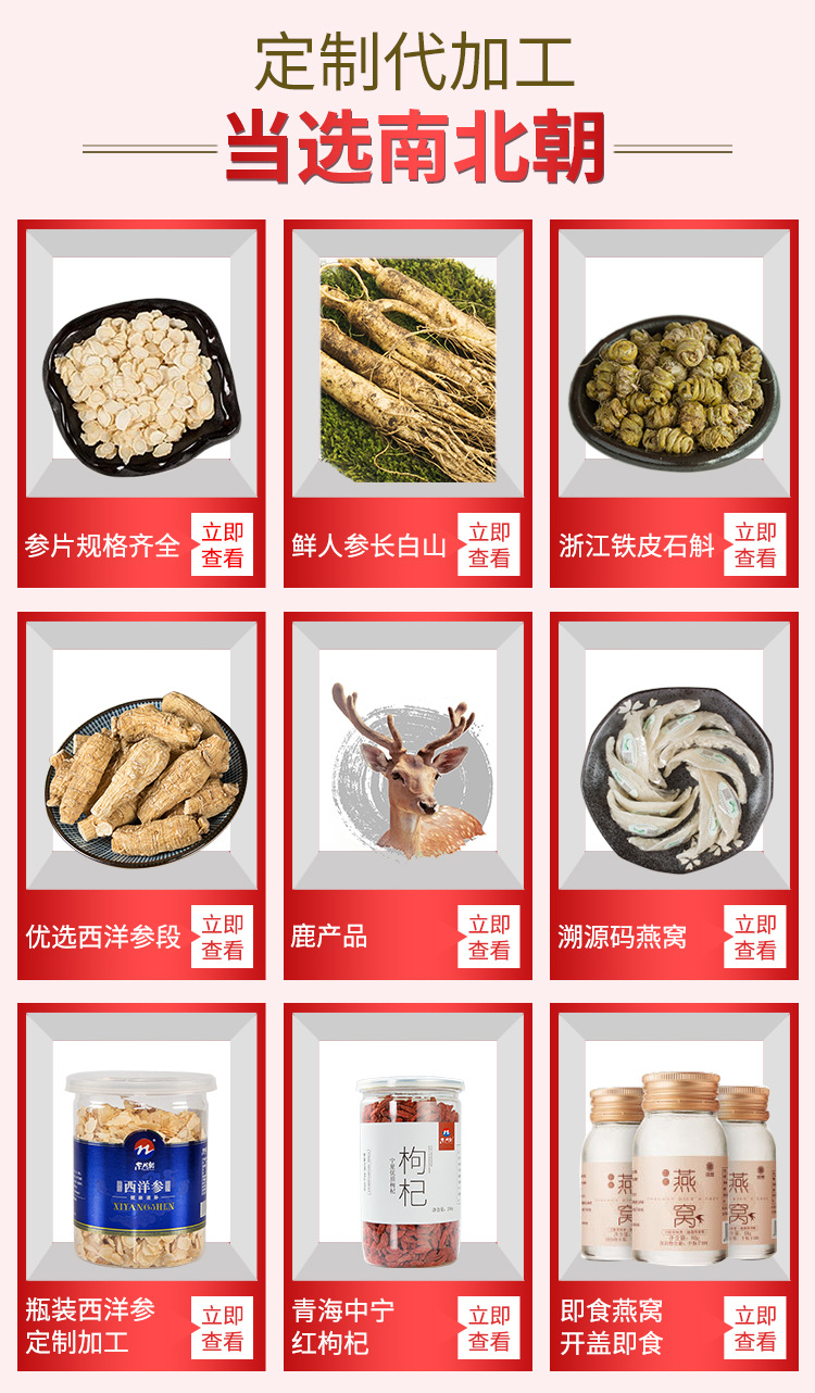 多年来坚持“品质保证、薄利多销”的批发理念,南北朝西洋参、冬虫夏草、燕窝等名贵滋补品涉及到了整个东南亚市场,成为国内出口贸易领军品牌之一。所有产品坚持原产地收购,保质保量,降低环节,靠薄利多销赢得了广大客户的信赖和支持。