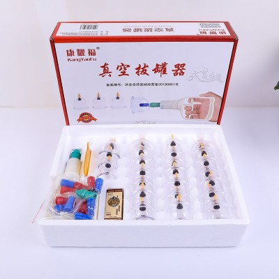 24罐套装配置:1号罐10个、2号罐10个、3号U型罐2个、4号U罐2个、大号抽气枪1把、精油1瓶、刮痧版1个,磁针12个、
