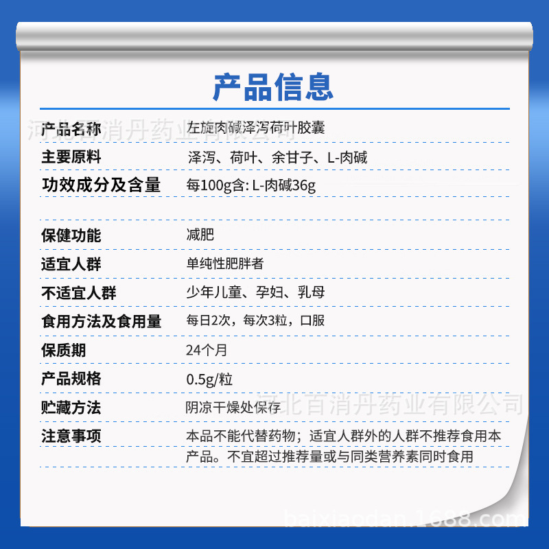 蓝帽保健品左旋肉碱泽泻荷叶胶囊60粒源头厂家定制批发直销