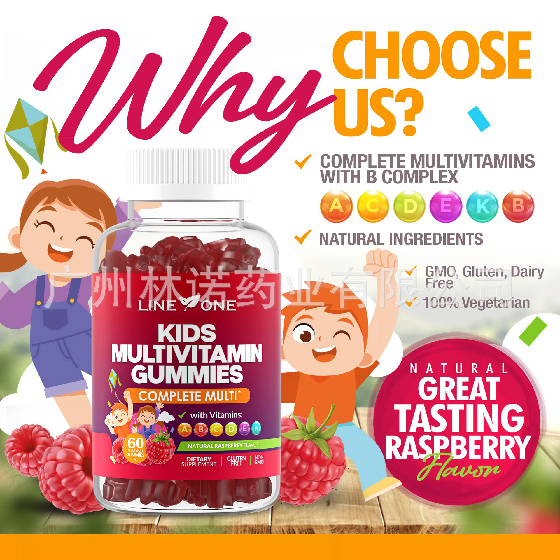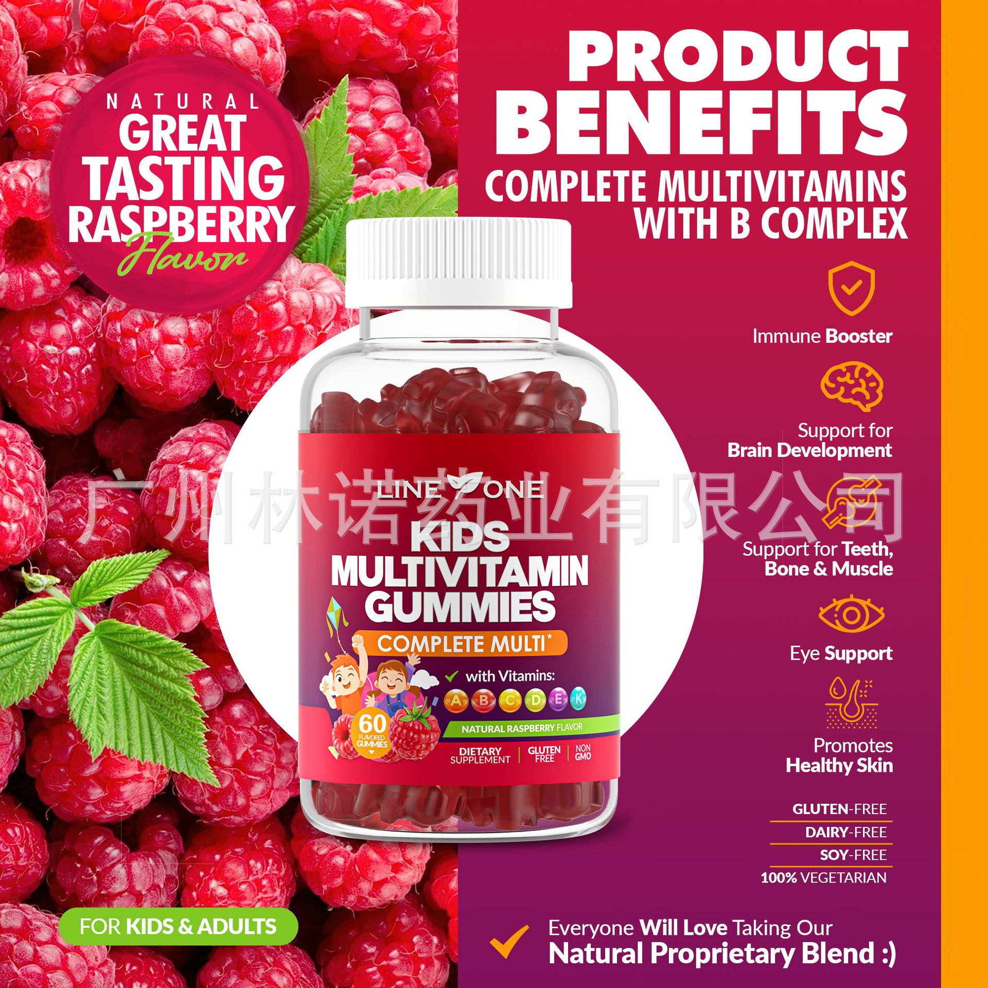 Kid's MULTI-VITAMIN Gummies, Raspberry flavor, Sugar Free