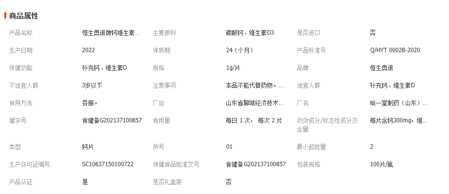恒生奥诺牌钙维生素D咀嚼片钙片 成人补钙保健食品